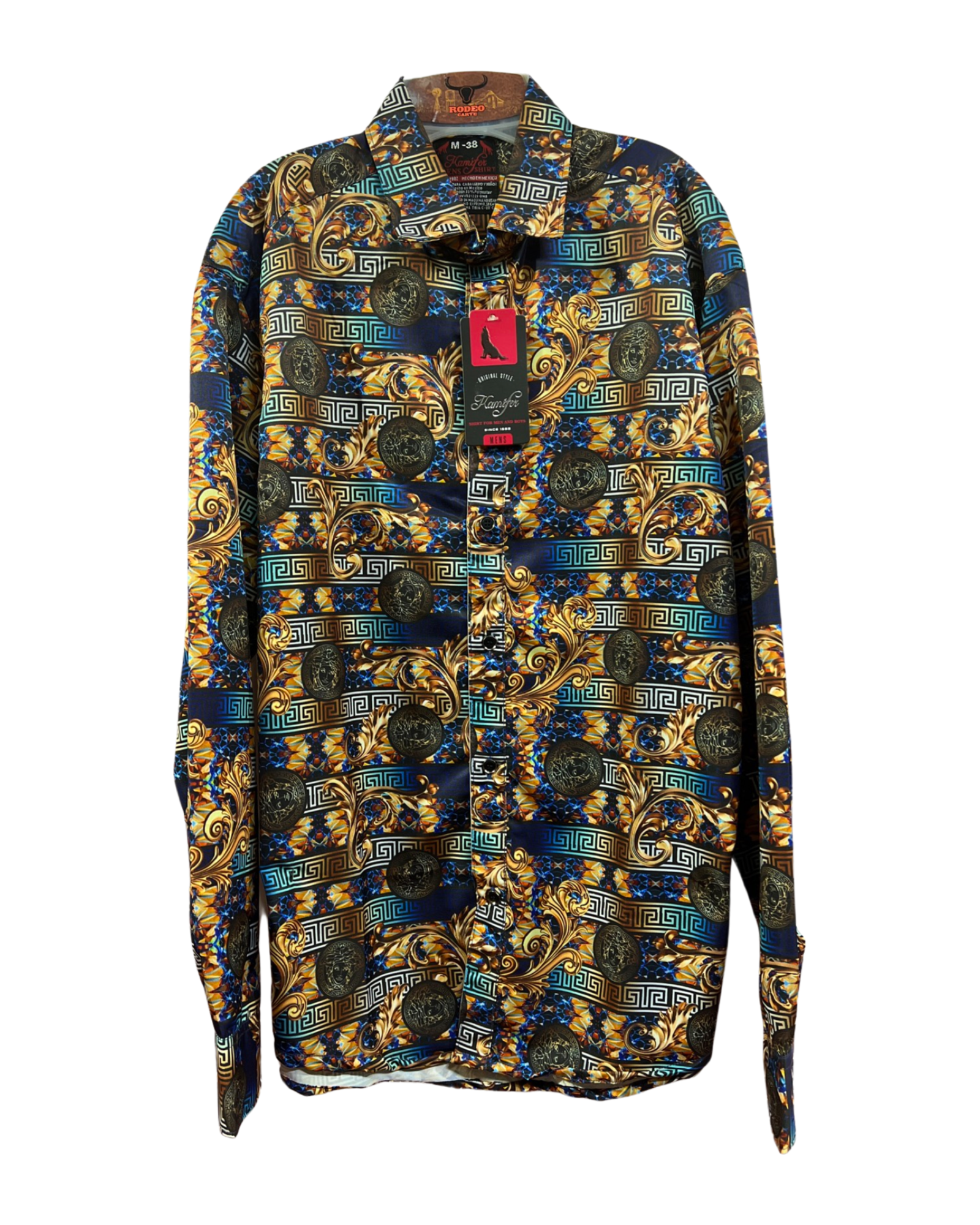 camisa casual satinada con estampado tipo versace.
